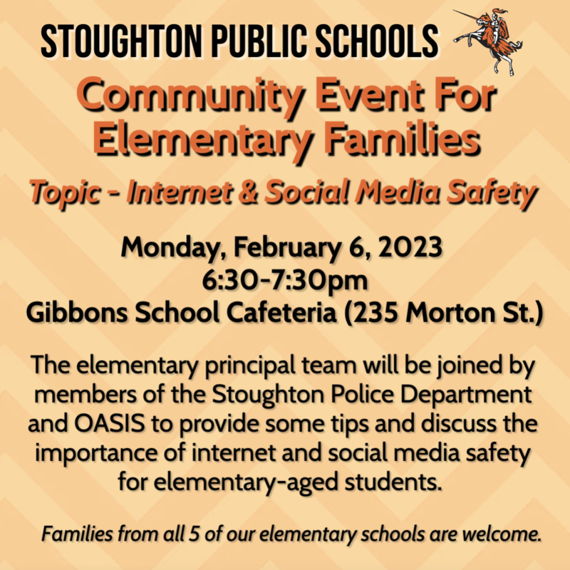 Parents/guardians of elementary school students are invited to join us at the Gibbons School cafeteria (235 Morton St.) on Monday, February 6, 2023 from 6:30-7:30 p.m. for a community event to learn about internet and social media safety for elementary-aged students.